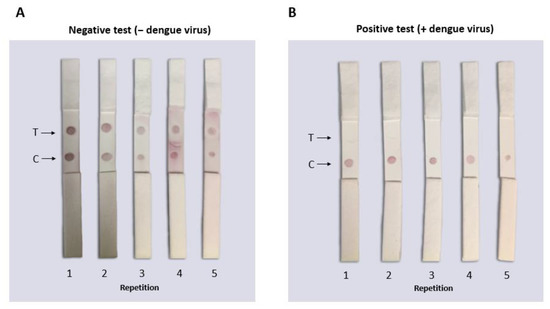 Functional reproducibility test of the lateral flow assay for the identification of flaviviruses. The tests were carried out with the same batch of tests assembled under the same conditions using PBS buffer for the negative sample or DENV for the positive sample (160 µL total volume). (A) In the LFAs where negative samples (only with PBS buffer) were placed, two red dots (signals) were observed indicating the absence of DENV. (B) In the LFAs where positive samples were placed (PBS and DENV), a single signal was observed in the control zone where the DENV in the sample “competed” with the virus immobilized in the LFA to bind to the biosensor. No false positives or negatives were observed in any of the tests performed.