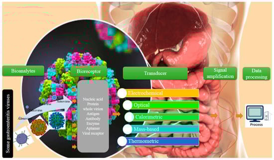 A schematic presentation of biosensor components applied for diagnosis of viruses associated with gastroenteritis. Biosensors are classified into electrochemical, optical, calorimetric, mass-based, and thermometric based on the types of their transducers and bioreceptors. The interaction of bioanalytes such as gastroenteritis viruses (rotavirus, calicivirus, astrovirus, and adenovirus) with different types of bioreceptor components including nucleic acid, protein, whole virus, antigen, etc., in various biosensing platforms produce a measurable signal through the transducer. Eventually, the signal is quantified using an analyzing system.