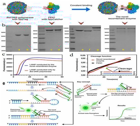 The recombinant FEN1-Bst DNA polymerase and a schematic illustration of flap-probe-based isothermal nucleic acid amplification method for rotavirus genome detection. (a) Schematic presentation of recombination through covalent binding of the SpyTag/SpyCatcher system. (b) SDS-PAGE confirmation of Bst DNA polymerase with SpyTag, FEN1 with SpyCatcher, and the new recombinant enzyme: lane a and b are reduced and non-reduced Bst DNA polymerase (SpyTag) protein, respectively; lane c is reduced FEN1 (SpyCatcher) protein while lane d is non-reduced one; Bst DNA polymerase (SpyTag) in lane e and FEN1 (SpyCatcher) in lane f form the novel recombinant enzyme protein (lane g); and lane h and i indicate novel recombinant enzyme protein. (c) Common LAMP reaction utilizing the novel recombinant enzyme. (d) Cleavage reaction of the flap structure using the novel recombinant enzyme to release fluorescent reporter that can be detected in real-time. (e) Overview of the mechanism and key concepts such as polymerization, flap structure creation, cleavage to release the fluorescent reporter, and real-time detection by analyzing fluorescent signal. Notes: LAMP, loop-mediated isothermal amplification. This figure was reprinted with permission from ref [115] Copyright 2022, Elsevier.