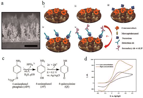 Preparation and characterization of concanavalin A (ConA)-based electrochemical biosensor. (a) The scanning electron microscope (SEM) image. (b) Schematic illustration of biosensor: (b(i)) after fixation of ConA, (b(ii)) after blocking using mercaptoethanol (MCH), (b(iii)) after norovirus fixation, (b(iv)) after fixation of first Ab, and (b(v)) after fixation of secondary Ab using (c) ALP-labeled antibody transforms APP to AP, which is then oxidized and produces a current at the electrode that is identical to the quantity of NoV bound to the sensor surface. (d) Signal reading by use of cyclic voltammetry (CV). The figure was reprinted with permission from ref. [146], Copyright 2014, Elsevier.