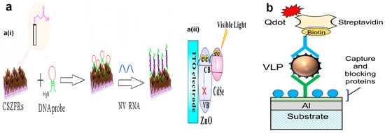 (a) A schematic presentation of (a(i)) the synthesis procedure and (a(ii)) electron transfer of CdSe–ZnO flower-rod core-shell structure (CSZFRs)-based photoelectrochemical (PEC) biosensor. (b) Schematic illustration of the surface of the V-trenches designed for detection of norovirus virus-like particle (VLP). The figures were reprinted with permission from refs. [148,149], Copyright 2018, Multidisciplinary Digital Publishing Institute (MDPI) and copyright 2017, Elsevier, respectively.