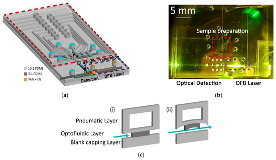 (a) PDMS device consisting of three distinct functional regions: sample preparation (red), light source (purple), and detection (green). (b) Top-down camera image of all-in-one chip. Scattering of DFB emission is visible through a long-pass filter that blocks pump laser. (c) Cross sectional diagrams of pneumatic lifting-gate valve structures with positive pressure used to close valves (i) and negative pressure used to lift valves and allows fluid flow (ii).