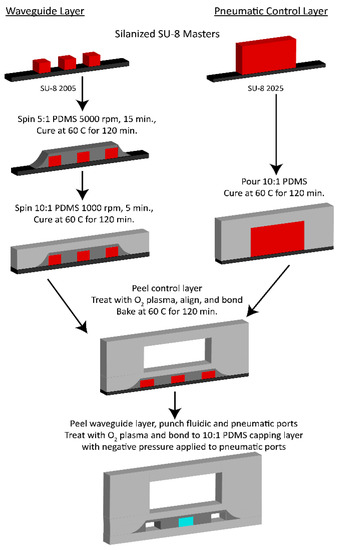 The all-in-one optofluidic device was fabricated in three layers using a soft lithography process outlined in [32] (Figure 3). One silicon master was fabricated using negative photoresist SU-8 2005 (Microchem, Round Rock, TX, USA) and consisted of fluidic channels and optical waveguides. A second master was fabricated using SU-8 2025 to produce taller features and contained pneumatic valves. Optical waveguides are created in the waveguide layer via total internal refraction where a refractive index difference is generated by using two different base-to-curing agent ratios when mixing PDMS (Sylgard 184) [33]. A 5:1 PDMS mixture that forms the waveguide core (refractive index 1.4170) is spun onto the waveguide master at 5000 RPM and for 15 min and then cured in a 60 °C oven for 2 h. A 10:1 mixture for the waveguide cladding (refractive index 1.4138) is then spun on at 1000 RPM for 5 min and then cured overnight. Simultaneously, a 10:1 mixture of PDMS was poured over both the pneumatic valve master as well as a blank wafer that was used as a capping layer. Both layers were then placed in the 60 °C oven to cure overnight.