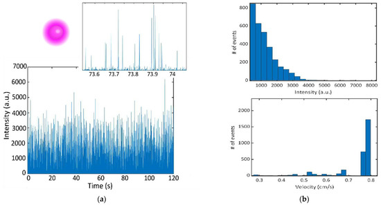 In the total 120 s trace, 3036 fluorescent events were detected, yielding a detection rate of 25.3 events/second. The average FWHM of detected events was 0.567 ms. The excitation volume was found to be 4.3665 × 10−10 mL (mode width × mode height × channel width: 4.1 µm × 7.1 µm × 15 µm), determined by the FWHM of the mode and the depth of the channel. The detected concentration was determined to be 3.29 × 107 beads/mL, or 54.62 fM. The initial proof-of-concept experiments that demonstrated sensing of 1 µm fluorescent beads using an on-chip DFB laser showed good agreement between the expected and experimental bead concentrations at femtomolar concentrations. The concentration demonstrated in [15] was 8 fM, thus illustrating a similar sensitivity of our device when compared with previous demonstrations using external excitation. The intensity histogram from the bead trace illustrates a tailed distribution (Figure 4b). This indicates that there are likely lower intensity signals that are missed. This could result from the bead traveling on the outer edges of the channel through a portion of the excitation volume with lower power. Despite this, the agreement of the expected concentrations indicates that the effect of this is small. Velocity of the beads is calculated by dividing the excitation width by each Δt value. The velocity distribution indicates that some of the events are capped by the frame rate of the camera collection. Since the max frame rate is 2000 frames per second, our time resolution is limited to 0.5 ms. This corresponds to a max detectable velocity of 0.82 cm/s. Since we do see that the majority of signals are at the max velocity, it is likely that the true average velocity is higher. This can be rectified in the future by using a single photon counter to provide high resolution in the time domain.
