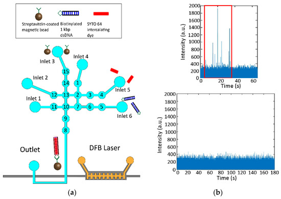 The next step was to demonstrate the ability to perform a bioassay on our fully integrated lab-on-chip device via the nonspecific staining and detection of 1 kbp dsDNA (Figure 5a). 2 µL of 1 × 108 magnetic beads per mL, 0.1 µM biotinylated 1 kbp dsDNA, and 50 µM SYTO 64 dye are loaded into three separate inlets. The 1 kbp dsDNA and the SYTO 64 dye are pushed into the central four mixing valves and incubated together for 10 min. After the dsDNA is stained with intercalating dye, the magnetic beads are added to the solution and incubated for a further 45 min. During the incubation, the DFB grating is filled with the gain medium and the pump beam is aligned in preparation. The completed assay was then cycled once through to the detection region of the device using sequential activation of valves 13–10–9–8.