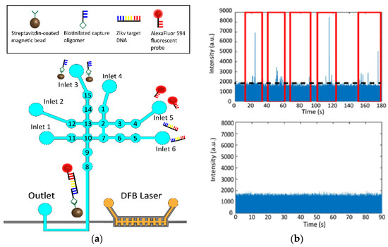 The final step was to complete a specific Zika bioassay from sample preparation to optical detection. Zika nucleic acids were optically detected in a magnetic bead-based assay that followed a similar protocol as described in [15] (Figure 6a). Initially, 2 µL of 1 × 109 magnetic beads per mL, 5 µM Zika target, and 5 µM AlexaFluor probe were placed on three separate inlets and the first valves in each line are loaded. The remaining three inlets were loaded with 1xTE buffer to be used for cycling and washing steps. The three constituents are then brought together in the central four mixing valves and cycled to mix sample solution. The entire device was then placed on a thermoelectric heater that heated the chip to 40 °C for 5 min. The chip was left to incubate for a further 25 min before being returned to its original mount where the external pump beam is aligned to the DFB grating to enable to on-chip excitation. A magnet was then placed underneath the chip to pull down the magnetic bead constructs that now have target and fluorescent probes attached, and 1xTE buffer was used to rinse away excess target and fluorescent probes three times.