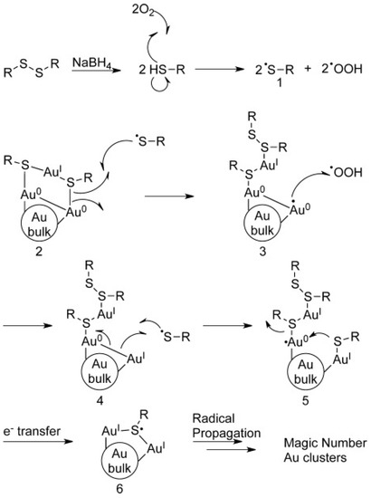 - Dreier, T.A.; Ackerson, C.J. Radicals Are Required for Thiol Etching of Gold Particles. Angew. Chem. Int. Ed. Engl. 2015, 54, 9249–9252. [Google Scholar] [CrossRef]