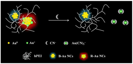 - Yang, H.; Yang, Y.; Liu, S.; Zhan, X.; Zhou, H.; Li, X.; Yuan, Z. Ratiometric and sensitive cyanide sensing using dual-emissive gold nanoclusters. Anal. Bioanal. Chem. 2020, 412, 5819–5826. [Google Scholar] [CrossRef]