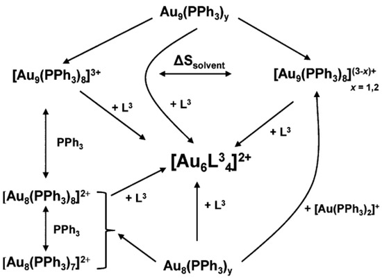 - Pettibone, J.; Hudgens, J. Gold cluster formation with phosphine ligands: Etching as a size-selective synthetic pathway for small clusters? ACS Nano 2011, 5, 2989–3002. [Google Scholar] [CrossRef] [PubMed]