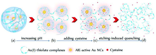 - Wang, J.; Lin, X.; Su, L.; Yin, J.; Shu, T.; Zhang, X. Chemical etching of pH-sensitive aggregation-induced emission-active gold nanoclusters for ultra-sensitive detection of cysteine. Nanoscale 2018, 11, 294–300. [Google Scholar] [CrossRef] [PubMed]