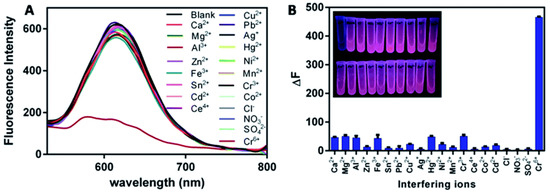 | SRBH 4 | Fluorescence (Reaction between potassium dichromate and non-fluorescent SRBH to produce highly fluorescent Rhodamine B) | 1.5 | 0.01–0.3 | Sensitive detection | Only used to detect CrO42− | [158] | |