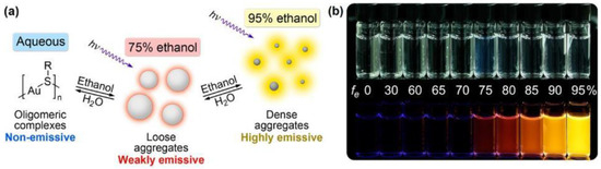 - Goswami, N.; Yao, Q.; Luo, Z.; Li, J.; Chen, T.; Xie, J. Luminescent Metal Nanoclusters with Aggregation-Induced Emission. J. Phys. Chem. Lett. 2016, 7, 962–975. [Google Scholar] [CrossRef]