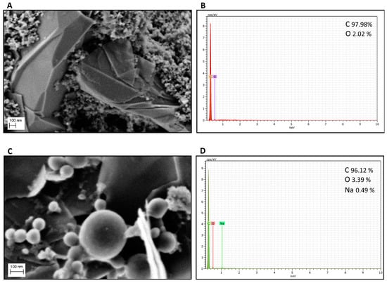 The morphological analysis of ChitNPs was realized by field emission scanning electron microscopy (FE-SEM) and energy-dispersive X-ray spectroscopy (EDX). Figure 1 shows the FE-SEM images of a bare GPH/SPE before (Panel A) and after (Panel C) the modification with ChitNPs. The bare GPH/SPE showed a densely packed rough surface, consistent with previous literature []. The EDX spectrum confirmed the presence of only carbon and oxygen, with an atomic percentage, calculated from the quantification of the peaks, of about 98% and 2%, respectively (Figure 1, Panel B). The FE-SEM image of ChitNPs/GPH/SPE shows aggregates of spherical nanoparticles with different diameters ranging from 70 to 300 nm (Figure 1, Panel C). The presence of the ChitNP aggregates may be ascribed to the inter- and intra-molecular cross-linkages mediated by the interaction of the positively charged amino groups of Chit and the negatively charged TPP ions []. The EDX spectrum of ChitNPs/GPH/SPE (Figure 1, Panel D) confirmed the presence of C (96%), O (3%), and a lower amount of Na (0.5%), probably due to the use of the TPP cross-linker in the procedure for the synthesis of ChitNPs.