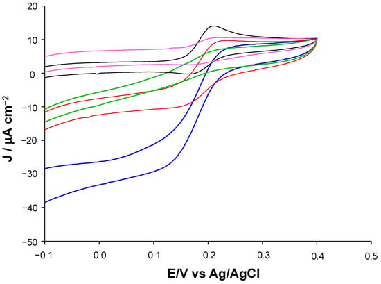 CVs of 50 μM dopamine in PBS (0.1 M, pH 7.2, KCl 0.1 M) on a GPH/SPE (pink line), a ChitNPs/GPH/SPE (black line), a Tyr/Chit/GPH/SPE (green line), a Np-Tyr/ChitNPs/GPH/SPE (red line), and a LbL-Tyr/ChitNPs/GPH/SPE (blue line). Scan rate: 10 mV s−1.