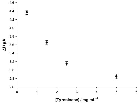The amount of immobilized enzyme is one of the most relevant parameters in electrode modification. Figure 3 shows the effect of the concentration of Tyr, immobilized by the LbL method on the Tyr/ChitNPs/GPH/SPE, on the cathodic peak current registered in the presence of 50 μM DA. The intensity current differences (∆I), calculated as the current differences obtained in the presence and the absence of Tyr, increase with decreasing concentrations of Tyr immobilized on the electrode surface. The optimal Tyr concentration was found to be 0.5 mg mL−1, attesting to the fact that electron transfer might be hindered at higher enzyme concentrations. Lower concentrations were also tested, showing no significant increase in the ∆I values.