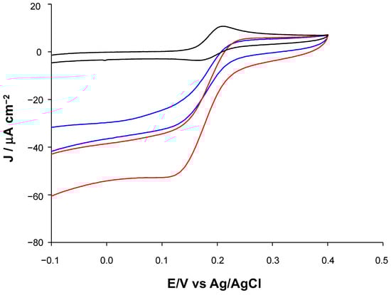 CVs of 50 μM DA in PBS (0.1 M, pH 7.2, KCl 0.1 M) on a ChitNPs/GPH/SPE (black line), a LbL-Tyr (0.5 mg/mL)/ChitNPs/GPH/SPE (blue line), and a LbL-Tyr (0.5 mg/mL)/EDC-NHS/ChitNPs/GPH/SPE (red line). Scan rate: 10 mV s−1.