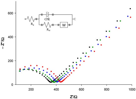 Nyquist plots of GPH/SPE (green), ChitNPs/GPH/SPE (black), Tyr/ChitNPs/GPH/SPE (blue), and Tyr/EDC-NHS/ChitNPs/GPH/SPE (red) measured in the presence of 5 mM [Fe(CN)6]3−/4− containing 0.1 M KCl solution. The inset shows the equivalent circuit used for fitting the experimental data.