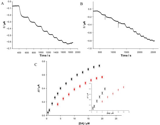 Typical chronoamperometric curves of Tyr/ChitNPs/GPH/SPE (Panel A) and Tyr/EDC-NHS/ChitNPs/GPH/SPE (Panel B) upon successive additions of different concentrations of DA to the stirred PBS (0.1 M, pH 7.2, KCl 0.1 M) (applied potential: 0 V vs. Ag/AgCl) and the relative calibration curves of Tyr/ChitNPs/GPH/SPE (Panel C, red curve) and Tyr/EDC-NHS/ChitNPs/GPH/SPE (Panel C, black curve) as a function of DA concentration. Inset: the magnification of the linear range.