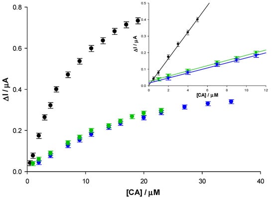 To address this issue, several analytical methods have been developed for in vitro CA monitoring, such as high-performance liquid chromatography (HPLC) [], HPLC with tandem mass spectrometric detection [,,], fluorescence [], and field-effect transistor [] methods. These methods show high sensitivity and selectivity but require sophisticated and expensive equipment, time-consuming procedures, and skilled operators. Electrochemical methods represent an interesting alternative thanks to their unique advantages, such as their low cost, rapid response, simple operation, and capability for in situ detection [,,,].