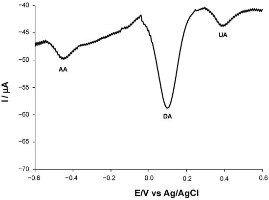 The selectivity of the Tyr/EDC-NHS/ChitNPs/GPH/SPE-based biosensor for DA was investigated by recording the current response in the presence of potential interferents, which can coexist in biological matrices. In particular, differential pulse voltammograms were recorded in a solution containing a 100-fold concentration of ascorbic acid (AA) and uric acid (UA) in the presence of DA. AA and UA usually show overlapping voltametric curves on both unmodified and chemically modified electrodes []. As shown in Figure 8, three well-resolved cathodic peaks were recorded at about −450, +100, and +400 mV for AA, DA, and UA, respectively. The results clearly demonstrate that AA and UA did not significantly interfere with DA detection, showing the high selectivity of the proposed biosensor.