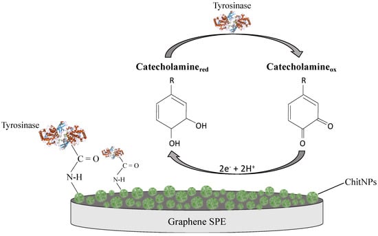 The signal amplification is assured by the recycling of the o-catecholamine quinone by Tyr enzyme, leading to an enhancement of the selectivity and sensitivity of the biosensor. Therefore, the key factor in biosensor construction is adequate and effective Tyr immobilization in order to enhance the catalytic activity. Common approaches utilized for Tyr immobilization include carbon paste immobilization [], sol–gel immobilization [], entrapment within electropolymerized conducting polymers [], and physical adsorption []. A considerable amount of attention has been paid to the use of chitosan (Chit), a polysaccharidic biopolymer composed of glucosamine with proper surface functional groups for biological/chemical binding and/or rapid adsorption [,]. It has found a great deal of applicability in sensing applications because of its non-toxicity, biocompatibility, biodegradability, and low cost []. Thanks to its polycationic character, chitosan can lock negatively charged proteins by charge attractions and hydrogen-bond interactions. Moreover, the presence of reactive amino and hydroxyl groups in its linear structure allows for covalent protein immobilization through the coupling chemistry via glutaraldehyde or EDC/NHS cross-linking agents [,]. However, its poor electrical conductivity may limit its applicability. To overcome this issue, chitosan has generally been combined with nanomaterials, such as graphene [], multi-walled carbon nanotubes [], and metallic nanoparticles [,,], as well as conducting polymers, such as polyaniline and polypyrrole [,]. Chitosan nanoparticles (ChitNPs) with a size smaller than 100 nm showed superior chemical and biological performances than pristine chitosan, making them an excellent source for biomedical and biotechnological applications [,]. Thanks to their high surface–volume ratio, they can be utilized in biosensing applications as enzyme immobilization supports to achieve ultrasensitive detection of biomolecules. To date, only a few reports have been published with this aim. Anusha et al. [] immobilized glucose oxidase (GOx) over ChitNPs on a gold electrode and, subsequently, Kim et al. [] developed a platform based on a poly-γ-glutamic acid/ChitNPs hydrogel, which embedded GOx and magnetic nanoparticles.