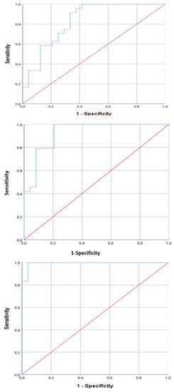 ROC curves between T0 and T1 (upper), between T0 and T2 (center), and between T0 and T3 (lower).