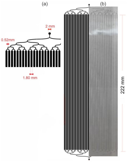 Layout Editor software was used for the design of the bioreactor microchannels architecture [27]. The LM bioreactor design involves 32 identical microchannels (1800 µm width), one inlet, and one outlet. The channel height is 200 µm, the channel surface area is 184 cm2, and the total internal volume is 2.8 mL in a 20 cm × 30 cm2 area. The design has curved wave channels in the connections to avoid the formation of bubbles and the accumulation of cells in straight corners [28].