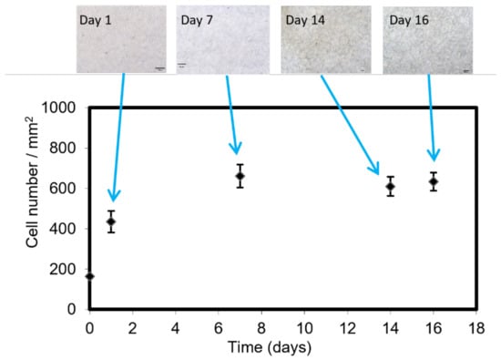The morphology of most cells was fusiform, with the appearance of borders that suggest a strong adhesion to the floor of the LM bioreactor [49], reaching 18 days of culture, a longer culture time than has been previously reported in the literature for microfluidic devices [28,45,50,51,52,53].