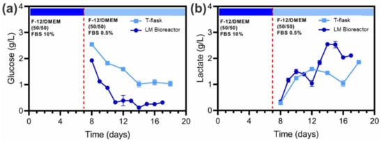 Glucose and lactate levels of the culture medium in traditional adherent cell cultures (T-flasks) and the LM bioreactor were quantified (Figure 5). In the T-flasks on day 8, the glucose concentration was 2.55 g/L and decreased until reaching 1.04 g/L on day 18 (Figure 5a), while the lactate concentration was less than 0.3 g/l on day 8 until reaching 1.86 g/L on day 18 (Figure 5b). On the other hand, the glucose concentration in the LM bioreactor was 1.93 g/L on day 8 and decreased to 0.32 g/L on day 17 (Figure 5a), while the lactate concentration was 0.34 g/L on day 1, and it increased to a maximum of 2.55 g/L on day 15 (Figure 5b).