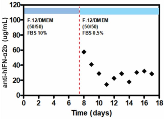 The production of anti-hIFN-α2b secreted by CHO-ahIFNα2b cells every 24 h for 18 days was evaluated (Figure 6). Initially, the concentration of anti-hIFN-α2b secreted by the cells was approximately 57 µg/mL, then mAb production decreased until day 12, when the cell line reached a plateau of anti-hIFN-α2b expression showing 32 µg/mL until the end of the culture on day 18. During the production phase, stressed cell signals were observed in the morphology of the cells, which was expected due to the reduced concentration of FBS in the production culture medium. This can affect cell growth and proliferation, redirecting cell metabolism primarily to antibody production.