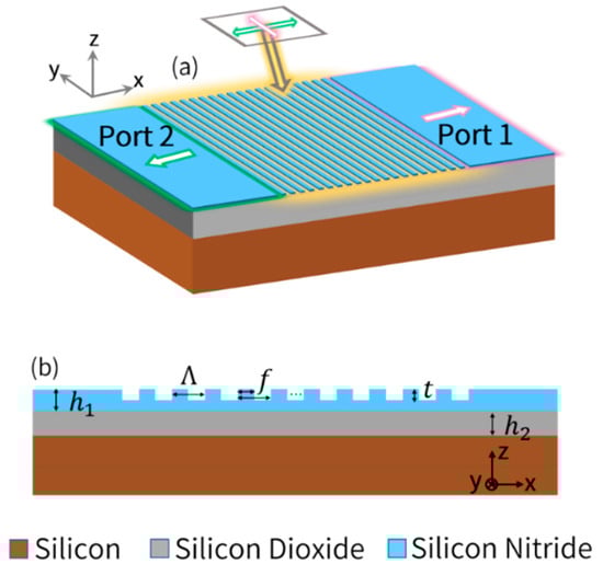 The overall structure of polarization-splitting grating coupler is shown in Figure 1a. The refractive indexes of silicon (Si) and silicon dioxide (SiO2) in the material database are 3.711 and 1.453 at 795 nm, respectively. Silicon nitride (SiN) with a thickness of 260 nm is applied instead of common SOI (silicon-on insulator) wafer as guided layer due to low propagation loss and suitable refractive index at = 795 nm (n0 = 1.997), which is the D1 transition wavelength of Rb. In addition, the transparent window of SiN extends to the visible and the near infrared spectrum, which can be applied for interaction of light with alkali atoms (e.g., K, Rb, and Cs) [53]. The cross-section view of this structure is depicted in Figure 1b. The two dimensional finite-difference-time-domain (FDTD) method is utilized to simulate the effectiveness of our design due to its broad width (12 μm) [54]. Non-uniform mesh grids are utilized in order to obtain trade-off between sufficient simulation accuracy and simulation time. Perfectly matched layer (PML) is applied in all directions to avoid boundary reflection. The grating operation can be well comprehended in terms of the Huygens–Fresnel principle, namely, constructive and destructive interference arising from wavefronts, which are generated by the diffraction of light from the grating teeth and grooves. The polarization-splitting grating coupler proposed in this paper is well described by the Bragg Law [55], as shown in Figure 2. The wave incident on grating is a guided wave propagating in a slab waveguide, with a direction of propagation in the identical plane as the grating, and is normal to the grating teeth. Grating coupler is a polarization-sensitive device, which means that incident light with different polarization (x-polarized or y-polarized) will excite different guided modes in the slab waveguide [56]. An additional compensatory wave vector is introduced by grating structure (blue arrow shown in Figure 2), which enables matching of the incident light wave vector ( shown in Figure 2) and fundamental guided mode wave vector in the waveguide ( and shown in Figure 2), and thus the fundamental transverse electric (TE) and fundamental magnetic (TM) mode are excited in Port 1 and Port 2, respectively, as described in Equations (10) and (11):