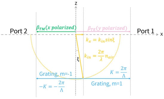 where and are propagation wave vector of the excited mode (i.e., fundamental TE and TM mode) in slab waveguide. is the incident wave vector, is the reciprocal lattice vector of the grating (i.e., additional compensatory wave vector), is the grating period, and is the tilted angle of incident light. In Figure 2, m is the diffraction order, where for fundamental TE mode and for fundamental TM mode are utilized in this paper. The calculated results of grating parameters are indicated in latter sections. When incident light with proper tilted angle propagates to the grating coupler, two orthogonal components (x- and y-polarized) are spatially divided and propagate to contrary directions, which are then coupled into two separate planar waveguides (Port 1 and Port 2 shown in Figure 1a). Specifically, the y-polarized component will be coupled to the fundamental TE mode of the high aspect ratio planar waveguide (12 μm × 260 nm, Port 1), while the x-polarized component will be coupled to the TM mode of the planar waveguide (Port 2) [57]. In order to suppress the effect of fluctuant intensity of incident light on measurement results and improve signal-to-noise ratio (SNR), differential detection of Port 1 and Port 2 is applied to measure the optical rotation angle of the linearly polarized probe light.