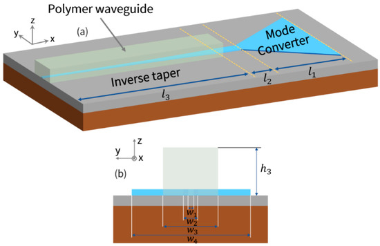 A schematic illustration of our proposed fiber-chip spot size converter (i.e., horizontal integration) is shown in Figure 3. Mode transition between the high aspect ratio planar waveguide and highly confined single-mode stripe waveguide is performed by the mode converter, and then the inverse taper is utilized to couple light from strip waveguide to lensed fiber. The length of the mode converter, single-mode stripe waveguide, and inverse taper are marked by , (=5 μm), and , respectively, as displayed in Figure 3a. A cross-section of the horizontal integration where the width of inverse taper tip, single-mode stripe waveguide, and planar waveguide are denoted by , , and , as shown in Figure 3b. A 5 μm × 5 μm ( = = 5 μm) polymer waveguide with a refractive index of about 1.506 covers the inverse taper, as shown in Figure 3a. The polymer waveguide is capable of mode size and effective refractive index matching between lensed fiber and chip, which means it is able to efficiently guide light from the inverse taper to lensed fiber [60]. Three-dimensional eigenmode expansion (3D-EME) and finite difference eigenmode (FDE) methods are exploited to design the horizontal integration, aiming to achieve high-efficiency coupling between the high aspect ratio planar waveguide (Port 1 and Port 2) and lensed fiber for both fundamental TE and TM modes at 795 nm.
