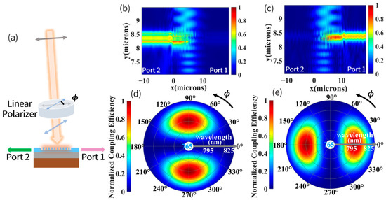 A Gaussian beam with a diameter of 8 μm was applied as the incident light of the grating coupler. Thickness of SiN () was 260 nm, grating fill factor () was 0.5, grating thickness () was 100 nm, and number of periods was 20. To satisfy the Bragg condition and maximize coupling efficiency [61], the grating period () and thickness of silicon dioxide () were 485 nm and 2025 nm, respectively. In addition, the tilted angle of incident light was 4° to minimize back reflection. Figure 4 shows the simulated coupling efficiency of orthogonal linear-polarized components (coupled to Port 1 and Port 2, respectively) under variation of incident wavelength and position. Figure 4a,b shows that when incident light deviates 4.2 μm from the left boundary of grating, the coupling efficiency was 33.1% at 795 nm for both x and y linearly polarized lights. Figure 4b reveals that maximal coupling efficiencies for y-polarized light at Port 1 and x-polarized light at Port 2 were 44.3% and 34.7%, respectively. Polarization-induced extinction ratio (PIER) was calculated to evaluate the crosstalk of different ports, which is defined as