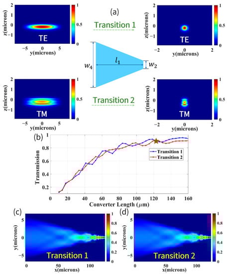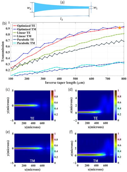 Figure 8a shows the schematic shape design of the proposed inverse taper, where width was tapered from 500 nm () down to a tip end 80 nm () to expand guided mode. From Figure 8b, we can see that with the increase in inverse taper length (), the transmission (i.e., coupling efficiency) both for TE and TM modes ascended gradually for the cases of parabolic, linear, and optimized profile used in our work. It can be clearly seen that the transmission of the parabolic inverse taper was low. The fabrication of the linear inverse taper was straightforward and convenient, but its drawback was that the coupling efficiency of the TE and TM modes was quite different. Ren et al. drew conclusions that device size, fabrication intolerance, and misalignment tolerance of quadratic inverse taper were outstanding; more importantly, that the quadratic inverse taper had little difference in transmission for fundamental TE and TM modes [63]. Therefore, to achieve efficient transmission of TE and TM modes simultaneously, a nearly quadratic taper was designed, as described in Equation (13):