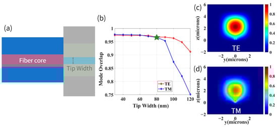 The mode converter is capable of transforming fundamental modes of broad waveguide into fundamental modes of strip waveguide, and inverse taper is deemed as an excellent candidate to realize coupling between strip waveguide and lensed fiber [62]. The coupling efficiency of an inverse taper for edge coupler is primarily governed by two factors: inverse taper shape design and tip width selection. The shape design of inverse taper should be judiciously carried out to efficiently steer the light from a single-mode strip waveguide to tip waveguide at the end of inverse taper, while tip width should be selected appropriately to achieve superior mode overlap with fiber. A proper value for tip width is initially explored by calculating mode overlap integral between the chip facet near the tip of the inverse taper and fiber, as illustrated in Figure 7a. The mode overlap as a function of tip width is shown in Figure 7b. It is evident that when the tip width exceeds 80 nm, the mode overlap of TE and TM will decrease significantly, and the mode overlap of TM is more sensitive to the tip width. The difference between TE and TM mode is induced by the fact that polarization of the TE mode is parallel to the direction of taper width, which varies gradually to 120 nm, while polarization of TM mode is parallel to the direction of taper thickness, which is a constant value (260 nm). In this condition, when the tip width is increasing, the confinement degree of inverse taper for TM mode becomes large than TE mode, that is to say, the delocalization of TM mode becomes weaker than TE mode [63], which means TM mode has a smaller mode profile, as shown in Figure 7c,d. To achieve efficient coupling for both TE and TM modes while thinking over convenience of fabrication, the tip width was chosen to be 80 nm, which results in approximately 96.7% mode overlap integral for both TE and TM modes (marked with a green star in Figure 7b).