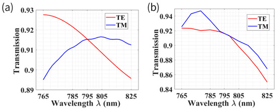 Figure 9 illustrates the operation bandwidth of the mode converter and optimized inverse taper in our study. From Figure 9a, we can see that for the mode converter, the coupling efficiency of TE and TM modes was still able to maintain more than 89% in the 60 nm (from 765 nm to 825 nm) range, and for the inverse taper, it was able to maintain more than 85% coupling efficiency, as shown in Figure 9b, which means that the fiber–chip spot size converter proposed in this paper is suitable for several chip-scale AMs (e.g., Rb, K). In addition, as for double beam Cs AMs [42,64,65,66], due to D1 and D2 lines (894 nm and 852 nm, respectively) of Cs being spectrally well separated, we are able to take advantage of the wavelength-dependent efficiency of this device. Specifically, such a grating-based polarimeter with a narrow bandwidth operating at D2 line of Cs could be designed judiciously, and coupling efficiency is almost zero at D1 line of Cs. This is a distinct advantage of such an integrated device compared with traditional and bulk PBS, because when dual co-propagating beams are utilized to pump and probe, it enables both filtering and differential optical rotation angle measurement simultaneously on chip.