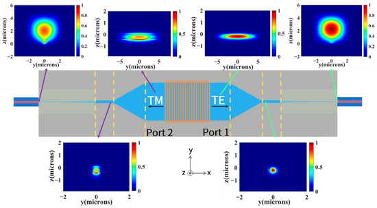 Mode evolution of the proposed polarization-splitting grating coupler with horizontal integration is shown in Figure 10. When the y-polarized incident light propagates to the polarization-splitting grating coupler, it will be coupled to the TE mode of planar waveguide on Port 1, as mentioned earlier; then converts to fundamental TE mode of strip waveguide by mode converter; and finally achieves efficient fiber–chip coupling with the help of the optimized inverse taper. When the incident light is x-polarized, it will be coupled to the TM mode on Port 2 and eventually be coupled into lensed fiber similarly. In summary, when the linearly polarized probe light that experienced optical rotation due to magnetically induced circular birefringence of Rb illuminates the structure, orthogonal linear-polarized components (x-polarized and y-polarized) can be split and coupled into the corresponding two lensed fibers with a coupling efficiency of 26.9% simultaneously. The optical rotation angle of linearly polarized probe light can be accurately measured by means of the differential detection method, and the unknown magnetic field can be subsequently obtained.