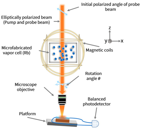 A schematic sketch of a chip-scale AM based on the polarization-splitting grating coupler with horizontal integration is demonstrated in Figure 11. A single elliptically polarized beam that is nearly resonant with transition center (detuned by 50 GHz from 87Rb D1 line) was employed. The circularly polarized component was utilized to achieve optical pumping, while the linearly polarized component was utilized to realize optical rotation detection [48]. The procedure of magnetic field measurement can be briefly summarized as follows: firstly, the circularly polarized component of incident light polarizes Rb by optical pumping, which can substantially increase the optical rotation angle [67]. Secondly, the custom Helmholtz magnetic coils are utilized to minimize ambient magnetic field, and then a small static magnetic field and an oscillating modulation field are generated. Thirdly, the transmitted light with optical rotation is focused on the coupler using microscope objective with large magnification to make spot size match. Eventually, the light coupled to Port 1 and Port 2 is collected to the balanced photodetector making use of a pair of lensed fibers.