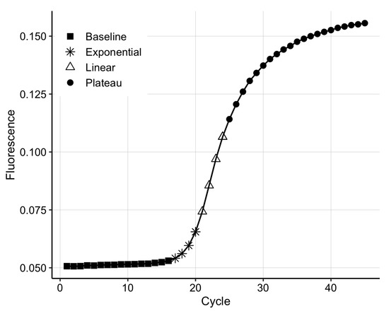 Polymerase chain reaction is based on the DNA replication process that naturally occurs during cell division. qPCR has four distinct phases (Figure 1); (1) during the background phase, the target DNA is too low in concentration, and the background noise covers the signal; (2) once the target DNA becomes detectable, the output signal enters the exponential phase, in which the DNA is doubled at every cycle; (3) in the exponential region, the curve is described by the equation , where n is the cycle number, is the number of DNA copies at cycle n, is the initial amount of DNA and E is the reaction efficiency [28]; (4) the linear phase appears due to inefficiencies in the amplification process, such as suboptimal melting temperatures for the primers and non-specific amplification. Finally, the process enters a plateau due to the depletion of qPCR resources, such as polymerase and primers.