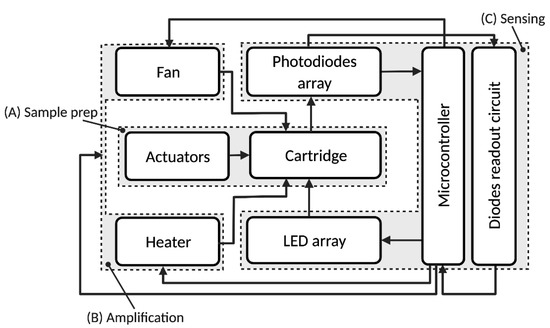 Block diagram of the protein quantification system. The different functional blocks are: (A) sample preparation; (B) thermocycler/DNA amplification; (C) sensing/data processing. Reprinted/adapted with permission from Ref. [17]. 2021, IEEE.