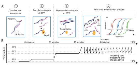 The aptamer-based method for ultrasensitive protein quantification is described in detail in [18] and briefly presented here. The aptamer and the adaptor are single-stranded DNA, each one being complementary to the other so that they are loosely bound by complementary base pair bonding to form a complex. To form such complexes, adaptors and aptamers are incubated for 15 min at 37 C. Then, the leptin sample is added to the complexes, which are displaced by the leptin molecules breaking the aptamer–adaptor bond and hybridising to the aptamers; therefore, the aptamer selectively disassociates from the nucleic acid to selectively bind to leptin in the sample. The solution is then incubated with the enzyme polymerase for 10 min at 60 C, which elongates the leftover complexes, thus turning them into double-stranded DNA ready for qPCR amplification. A graphical description of the protocol is presented in Figure 3.