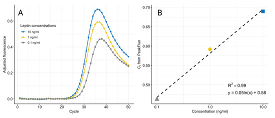 PeakFluo improves linearity by removing the residual fluorescence introduced by the leptin, aptamers and free adaptors remaining in the solution, because they could interfere with the qPCR. This residual fluorescence can be removed by including a negative control, thus improving the precision of the measurement. The algorithm also reduces the time-to-results, as it allows the qPCR to stop around cycle 35 (see Figure 7), thus reducing the time-to-result by approximately 20 min. Finally, the PeakFluo method operates in real time and it is easily implementable on a portable device.