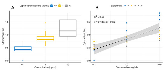 Boxplot showing the variation in normalised leptin concentrations for three experiments on separate days (A). Linear fit of normalised leptin concentrations for three experiments on separate days with 95% confidence intervals (B). All samples were ran in triplicates and data were normalised by dividing each value by the average value for all concentrations in a given experiment.