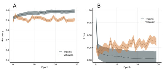 Model accuracy (A) and loss (B) from 10-fold stratified cross-validation. Data presented as average and standard deviation.