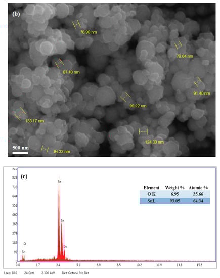 The morphology and surface structure of prepared SnNPs were analyzed by SEM, as shown in Figure 1a,b. The synthesized SnNPs were uniform in both size and shape with a mean diameter of ~60 nm, as determined from the crystal size analysis in XRD. The EDX spectra are also presented in the inset of Figure 1c, which confirm the presence of tin within the nanomaterial.