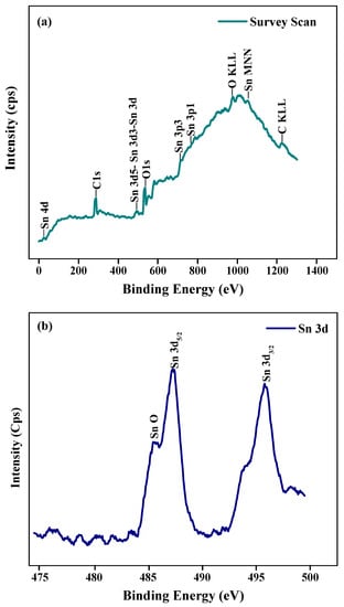 For further elucidation of the composition phase and chemical state of the prepared nanomaterial, X-ray photoelectron spectroscopy (XPS) was also performed to investigate its surface chemical state. The presence of Sn, O, and C elements was confirmed in the XPS data, as shown in Figure 3a, with high-resolution XPS spectra for Sn 3d3/2 and Sn 3d5/2 (Figure 3b). The Sn 3d5/2 and Sn 3d3/2 peaks were fitted by peaks at binding energies of 485.5, 487.2, and 494.3 eV, which correspond to Sn, Sn+2, and Sn+4 []. However, XPS data also exhibited two small peaks of O 1s at 533 and 973 eV, but FTIR data confirm a negligible amount of oxygen in the system. Thus, these peaks in XPS might be of oxygen present in the environment while performing XPS. In summary, our results appear to verify the purity of the prepared nanomaterial elements in the metallic state.