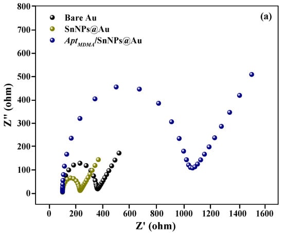 To prove the feasibility of biosensing with the aptasensor described above, PEIS and CV were used to study the interfacial properties of the electrode during the sequential stages of its fabrication. PEIS measures charge transfer resistance (Rct) values, which represent charge transfer kinetics in the absence of mass transfer limitation and are inversely proportional to the exchange current between the electrolyte and the sensing surface. Figure 4a illustrates the Nyquist graphs of the electrode during its stepwise modification. It shows that the impedimetric response decreased at SnNPs@Au (Rct = 226 Ω) compared to the bare electrode (Rct = 360.9 Ω), which further increased for the AptMDMA/SnNPs@Au-modified electrode (Rct = 1.055 kΩ). This result indicates that SnNPs had the highest conductivity with a high surface area, which supports a dynamic balance of the Sn° = Sn2+ + 2e− mechanism. The presence of Sn2+ and the induced electron contributing conductance in the system caused low Rct values [,]. On the other hand, the negative charges on the phosphodiester backbone of AptMDMA caused the repulsion of redox species [,], thus reducing the redox reaction and enhancing the Rct value to 98.2% from the bare electrode.