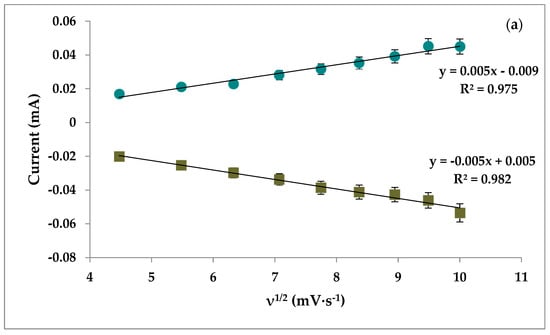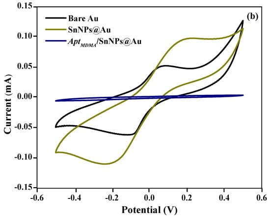 The conducting properties of the SnNPs@Au-modified surface likely arise from its high surface area, which was calculated by the Randles–Sevcik equation. Figure 5 shows a linear relationship between redox current peaks and the square root of the scan rate of bare and SnNPs@Au-modified electrodes. As per Equation (2), the bare electrode has a surface area of 0.034 mm2, which increased ~40-fold after successful SnNPs electrodeposition. The large electroactive surface area of SnNPs@Au (1.42 mm2) not only improves the sensitivity of the sensor but also provides a large area for AptMDMA immobilization [,].