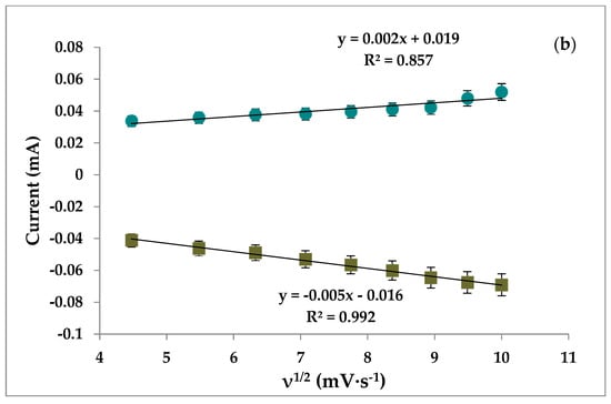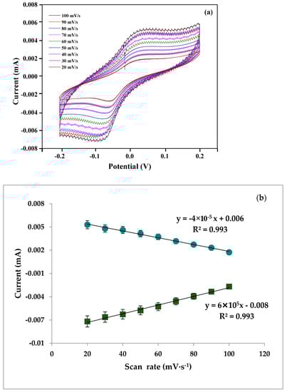 Determination of redox mechanism of aptasensor in 5.0 mM [Fe(CN)6]3−/4− and 0.1 M KCl electrolyte in the presence of 0.33 nM. (a) Change in CV curves at scan rates of 20, 30, 40, 50, 60, 70, 80, 90, and 100 mV/s. (b) Calibration curves of redox peak current vs. scan rate.